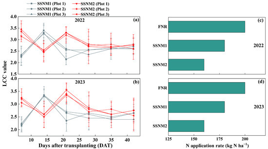 In 2022 and 2023, the LCC values (3.3–3.4) of SSNM1 were above 3.0 only at 14 DAT, while during other periods they ranged from 2.2 to 2.7 (Figure 2a,b). In contrast, the LCC values (3.1–3.6) of SSNM2 exceeded 3.0 at 7 and 21 DAT, while remaining between 2.5 and 2.9 at other sampling times (Figure 2a,b). Compared with FNR, the N application rates in SSNM1 and SSNM2 were reduced by 10% and 20%, respectively, over the two years (Figure 2c,d).