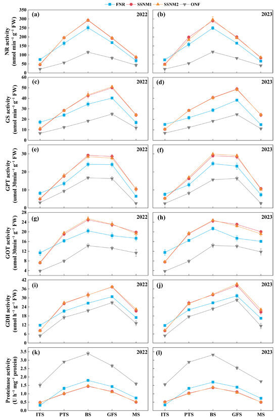 In 2022 and 2023, compared to ONF, N application treatments (FNR, SSNM1, and SSNM2) increased the activities of NR, GS, GPT, GOT, and GDH while reducing proteinase activity throughout the growth stages (p < 0.05) (Figure 3a–l). There were no significant differences in the activities of NR, GS, GPT, GOT, GDH, and proteinase between SSNM1 and SSNM2 (p > 0.05) (Figure 3a–l). At ITS, the activities of NR, GS, GPT, GOT, and GDH under SSNM1 and SSNM2 were lower than those under FNR, while proteinase activity was higher. However, this trend was reversed during other growth stages (Figure 3a–l). Specifically, compared with FNR, the activities of NR, GS, GPT, GOT, and GDH under SSNM1 were 35.7%, 34.5%, 34.5%, 35.2%, and 30.0% lower at ITS, respectively, while proteinase activity was 53.9% higher (mean of two years) (p < 0.05). Compared with FNR, the activities of NR, GS, GPT, GOT, and GDH under SSNM1 were 16.3–26.6%, 25.2–52.3%, 19.4–54.0%, 17.1–28.7%, and 20.3–25.6% higher in the subsequent growth stages, respectively, while proteinase activity was 19.6–31.8% lower (averaged across two years) (p < 0.05). Similarly, compared with FNR, the activities of NR, GS, GPT, GOT, and GDH under SSNM2 were 36.2%, 32.2%, 33.6%, 34.2%, and 29.4% lower at ITS, respectively, while proteinase activity was 52.9% higher (mean of two years) (p < 0.05). Compared with FNR, the activities of NR, GS, GPT, GOT, and GDH under SSNM2 were 16.7–31.4%, 24.9–53.3%, 19.7–51.1%, 15.2–27.4%, and 21.0–33.9% higher during the remaining growth stages, respectively, while proteinase activity was 18.1–29.8% lower (averaged across two years) (p < 0.05).