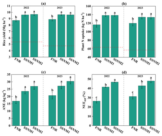 Rice yield and nitrogen use efficiency based on the leaf color chart (LCC). (a) Rice yield, (b) plant nitrogen uptake, (c) agronomic nitrogen efficiency (ANE), and (d) nitrogen use efficiency based on difference (NUEdiff). FNR, Farmer’s customary nitrogen application practices; SSNM1, Urea application based on LCC; SSNM2, Controlled-release urea (CRU) application based on LCC. The red lines indicate no N fertilizer application level. Error bars represent the standard deviation (SD). Different letters above the bars indicate significant differences at the 5% level.