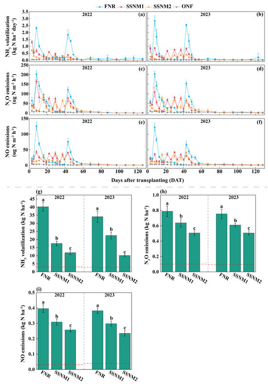 Gaseous nitrogen emissions from rice fields based on the leaf color chart (LCC). Ammonia (NH3) volatilization flux in (a) 2022 and (b) 2023; nitrous oxide (N2O) emission flux in (c) 2022 and (d) 2023; nitric oxide (NO) emission flux in (e) 2022 and (f) 2023; NH3 (g), N2O (h), NO (i) cumulative emissions during the rice-growing season. FNR, Farmer’s customary nitrogen application practices; SSNM1, Urea application based on LCC; SSNM2, Controlled-release urea (CRU) application based on LCC. The red dashed line represents the baseline gaseous nitrogen emissions from rice fields without nitrogen fertilizer application (ONF). The red lines indicate no N fertilizer application level. Error bars represent the standard deviation (SD). Different letters above the bars indicate significant differences at the 5% level.