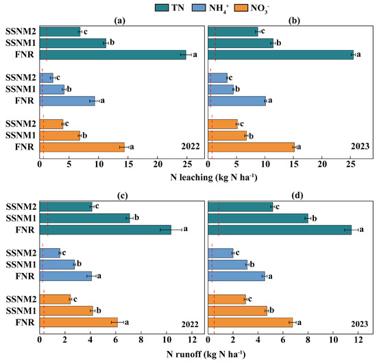 Nitrogen leaching and runoff in rice fields based on the leaf color chart (LCC). Nitrogen leaching in (a) 2022 and (b) 2023; nitrogen runoff in (c) 2022 and (d) 2023. FNR, Farmer’s customary nitrogen application practices; SSNM1, Urea application based on LCC; SSNM2, Controlled-release urea (CRU) application based on LCC. The red dashed line represents the baseline nitrogen leaching and runoff in rice fields without nitrogen fertilizer application (ONF). The red lines indicate no N fertilizer application level. Error bars represent the standard deviation (SD). Different letters above the bars indicate significant differences at the 5% level.