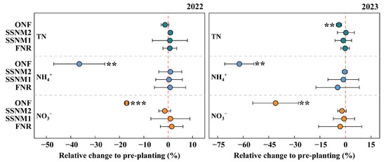 Changes in soil nitrogen content in rice fields based on the leaf color chart (LCC). FNR, Farmer’s customary nitrogen application practices; SSNM1, Urea application based on LCC; SSNM2, Controlled-release urea (CRU) application based on LCC; ONF, Omission of nitrogen fertilizer. Error bars represent 95% confidence intervals (CIs). A total of 95% CIs that overlap with zero indicate no significant difference from the pre-planting levels in 2022. The red dashed line marks the point of no relative change (zero). ** p < 0.01. *** p < 0.001.