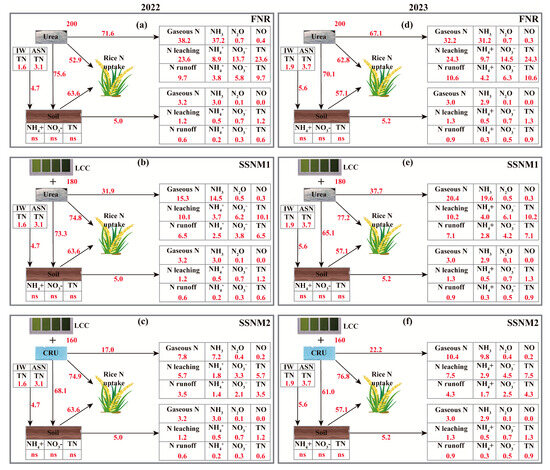 Nitrogen balance in rice fields based on the leaf color chart (LCC). (a–c) show the nitrogen input and output of paddy fields under FNR, SSNM1, and SSNM2 treatments in 2022, respectively; (d–f) display the corresponding data for 2023. FNR, Farmer’s customary nitrogen application practices; SSNM1, Urea application based on LCC; SSNM2, Controlled-release urea (CRU) application based on LCC; ONF, Omission of nitrogen fertilizer; IW, Nitrogen content in irrigation water; ASN, Atmospheric nitrogen deposition. The red numbers represent nitrogen inputs and outputs (kg N ha−1). ns indicates no significant difference compared with the pre-planting levels in 2022.