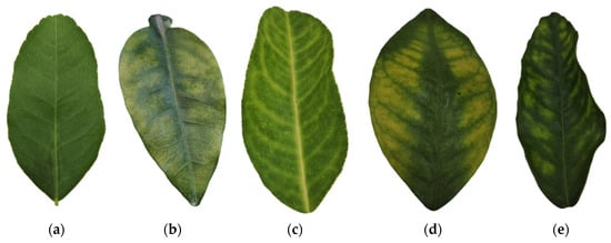 Five categories of sampled citrus leaves: (a) healthy; (b) Huanglongbing; (c) Yellow Vein Disease; (d) magnesium deficiency; (e) manganese deficiency.