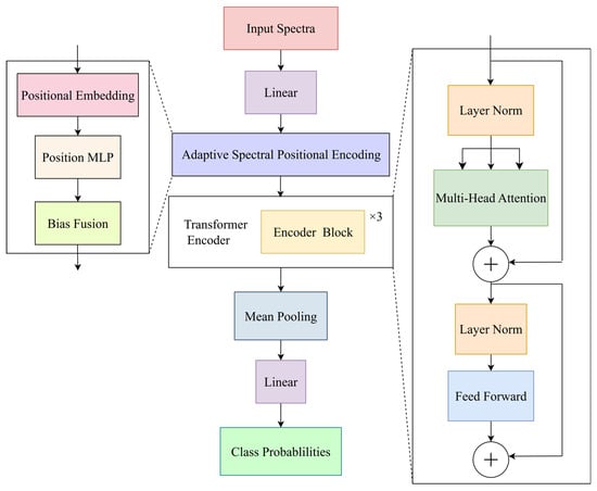 This study proposes ASTransformer (Adaptive Spectral Transformer), specifically designed for near-infrared (350–2500 nm) one-dimensional spectral classification and detection of citrus leaf physiological and pathological conditions. The model architecture is shown in Figure 3. The overall architecture of ASTransformer follows the multi-head self-attention and feed-forward network structure of the original Transformer encoder, with key innovations in the positional encoding module to maximize the preservation of Transformer’s advantages in modeling global dependencies [37,38], while finely capturing differential information across different wavelength bands in discriminating physiological and pathological conditions. Specifically, ASTransformer first projects the original 2151-dimensional spectral reflectance vector into a 128-dimensional feature space through a linear mapping layer, then enhances the projected features using the adaptive spectral positional encoding mechanism proposed in this study: at each wavelength position, ASTransformer maintains a set of trainable positional embedding vectors and fine-tunes them through a two-layer fully connected network (Linear–ReLU–Linear) in an input-independent manner to generate the final positional bias matrix. This bias matrix is continuously optimized adaptively during training, enabling the model to automatically enhance its representational capability for key wavelength bands and suppress attention to redundant or noise bands according to data statistics and task requirements. The feature sequence fused with positional encoding is then fed into an encoder consisting of 3 stacked TransformerEncoderBlocks, where each layer performs multi-head self-attention to aggregate interaction information between different wavelength bands [39] and further refines high-order features through feed-forward networks; the encoder output undergoes global average pooling in the wavelength dimension to obtain a unified-length feature vector, which is finally mapped to five-class output through a fully connected layer.