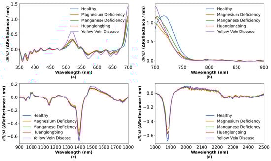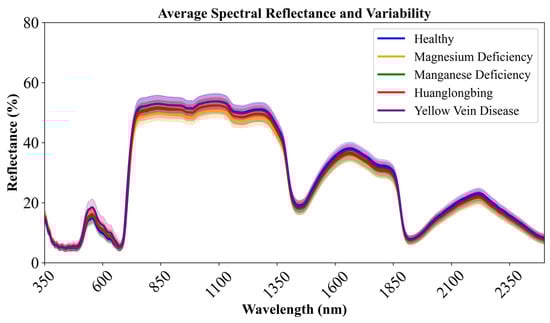 Figure 5 presents the average spectral reflectance and variability of five categories of citrus leaf samples. Each curve represents the average reflectance of one category (Healthy, Huanglongbing, Yellow Vein Disease, Magnesium Deficiency, and Manganese Deficiency) across the wavelength range from 350 nm to 2500 nm. Chlorophyll content is a key factor influencing leaf spectral reflectance [43]. In the visible light region (approximately 400–700 nm), chlorophyll primarily absorbs red light (approximately 600–700 nm) and blue-violet light (approximately 400–500 nm) for photosynthesis. Therefore, normal leaves exhibit relatively low reflectance due to high chlorophyll content and pronounced absorption [44]. Reflectance changes are directly correlated with chlorophyll content and photosynthetic efficiency. A relative peak appears in the green light region (500–600 nm), which is an area where chlorophyll absorption is relatively weak, accounting for the green appearance of plants. The reflectance variations near 550 nm primarily reflect differences in chlorophyll content.