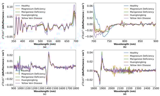 In the red-edge region (700–800 nm), Figure 6b reveals significant shifts in peak position and magnitude for the first-order derivative, corresponding to the abrupt transition from strong chlorophyll absorption in the red band to high reflectance in the near-infrared band. Physiological and pathological stress-induced chlorophyll degradation and mesophyll cell disruption reduce absorption near 680 nm and alter scattering properties, causing the red edge to shift toward shorter wavelengths [48]. Figure 7b shows that second-order derivatives sensitively detect subtle changes in the red-edge slope.