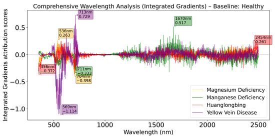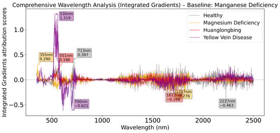 As shown in Figure 12, the analysis results with Manganese Deficiency as baseline show different spectral response patterns, with the Yellow Vein Disease category exhibiting the strongest integrated gradient value at 530 nm, far exceeding other categories, while the main contribution band of the healthy category shifts to 713 nm. Particularly, the healthy category shows a strong negative peak at 2227 nm in the near-infrared region, a feature rarely seen in other baseline analyses, reflecting the unique near-infrared spectral response mechanism specific to manganese deficiency.