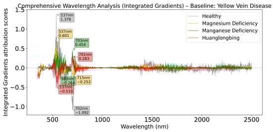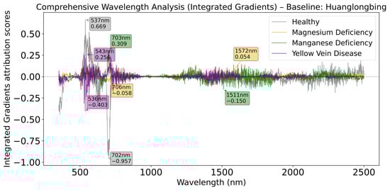 The integrated gradients method reveals the relative importance of different spectral bands in physiological and pathological identification by calculating the gradient integral of model output with respect to each wavelength of the input spectrum. The integrated gradients analysis plot displays the IG curves for different physiological and pathological categories relative to the healthy reference spectrum across the wavelength range of 350 nm to 2500 nm, directly reflecting the diagnostic value of each spectral band in the input spectral data. The horizontal axis represents wavelength, while the vertical axis shows the normalized IG values (indicating the importance of the spectral band at that wavelength for “category i vs. healthy” discrimination). The colored curves correspond to four physiological and pathological categories: Magnesium Deficiency (orange), Manganese Deficiency (green), Huanglongbing (red), and Yellow Vein Disease (purple). The dashed line (y = 0) serves as the reference level. When the IG curve of a category is above zero at a certain wavelength, it indicates that this wavelength band makes a positive contribution to distinguishing that category from healthy samples. When the IG curve is below zero, it suggests that the spectral features at that wavelength band are unimportant for the model’s judgment of that category, or drive the model output in the opposite direction (more towards healthy).