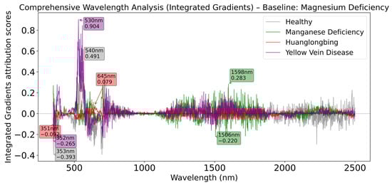 Comprehensive wavelength analysis (Integrated Gradients) relative to Magnesium Deficiency baseline.