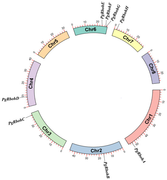 Genes were named PgRbohA–H based on their chromosomal positions. Physicochemical properties were predicted using TBtools software. Subcellular localization of PgRboh proteins was predicted with Plant-mPLoc (http://www.csbio.sjtu.edu.cn/bioinf/plant-multi/, accessed on 21 December 2024).