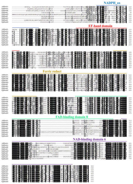 The sequence alignment of PgRboh proteins with Arabidopsis AtRbohA revealed four conserved domains (Figure 3): the NADPH_Ox and EF-hand domains located in the N-terminal region, and the FAD_binding_8 and NAD_binding_6 domains in the C-terminal region.