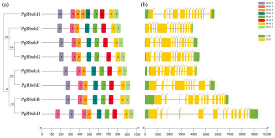 Motifs and gene structures of PgRboh family members. (a) Motif analysis; (b) gene structure. Yellow and green parts represent coding sequences (CDS) and untranslated regions (UTRs), respectively.