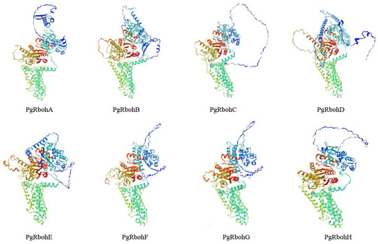 PgRbohs mainly consist of α-helices, extended strands, and random coils. In PgRbohA, PgRbohD, and PgRbohE, random coils are most abundant, followed by α-helices and extended strands. In the other five proteins, α-helices are most abundant. PgRbohE has the highest random coils (46.78%), while PgRbohF has the lowest (43.14%). PgRbohB has the most α-helices (44.99%), and PgRbohA the least (41.38%). Phosphorylation site prediction shows serine and threonine are most common, with lysine being least common (Table 2). Tertiary structure analysis indicated a high degree of similarity between PgRbohF and PgRbohG, with reduced similarity observed among the other six proteins (Figure 5).