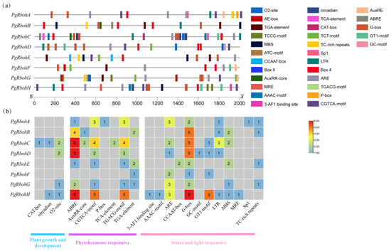 Cis-acting elements are key in gene expression regulation. To investigate PgRboh genes transcriptional regulation, 2000 bp upstream sequences were analyzed with PlantCARE. As shown in Figure 6, 22 representative cis-acting elements were identified, including 7 stress-responsive elements, 12 hormone-responsive elements, and 3 growth/development-related elements. The growth and development elements mainly include circadian rhythm-responsive elements (circadian, two), meristem-specific elements (CAT-box, one), and the cis-acting regulatory element involved in zein metabolism regulation (O2-site, six). The hormone response elements mainly consist of abscisic acid-responsive elements (ABRE, 26), MeJA-responsive elements (TGACG-motif and CGTCA-motif, 32), auxin-responsive elements (AuxRR-core and TGA-element, 9), salicylic acid-responsive elements (TCA-element, 2), and gibberellin-responsive elements (P-box, 1). Stress-responsive elements primarily included light-responsive elements (such as 3-AF1 binding site, AAAC-motif, G-Box), anaerobic induction elements (ARE, 14), low-temperature responsive elements (LTR, 7), and drought-induced elements (MBS, 8). Light-, MeJA-, and abscisic acid-responsive elements are highly enriched in most PgRboh promoters, while low-temperature responsive elements are enriched in PgRbohA–D and PgRbohH.