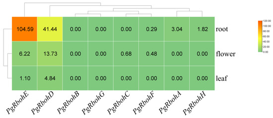 PgRboh expression varies significantly across tissues (Figure 7). PgRbohA and PgRbohH are only expressed at low levels in roots, with PgRbohA more highly expressed. PgRbohC is expressed at low levels exclusively in flowers, while PgRbohF is expressed in both roots and flowers, but its expression level is lower than that of the aforementioned tissue-specific genes. PgRbohB and PgRbohG are not expressed in any tissue. In contrast, PgRbohD and PgRbohE are expressed in all tissues, and their expression levels are significantly higher than those of the other genes across all tissues.