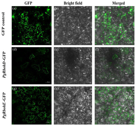 Due to the relatively high expression levels of PgRbohD and PgRbohE in all the tissues mentioned above, these two PgRboh genes were selected for fusion with pCAMBIA1300-35S-EGFP and transiently expressed in tobacco epidermal cells. In cells expressing the empty GFP vector, fluorescence was detected in both the nucleus and cell membrane (Figure 8a–c). In contrast, GFP signals from PgRbohD-GFP and PgRbohE-GFP were restricted to the cell membrane, with no nuclear localization (Figure 8d–i), confirming their membrane localization.