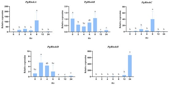 Expression analysis of Rboh family members in pomegranate under cold treatment. Two-month-old pomegranate seedlings were subjected to 4 °C treatment at time intervals of 0, 2, 4, 6, 8, 12, and 24 h. Fifteen seedlings were used at each time point, and every five seedlings were pooled as one biological replicate, with a total of three biological replicates set up. Different letters indicate significant differences (ANOVA analysis, p < 0.05).