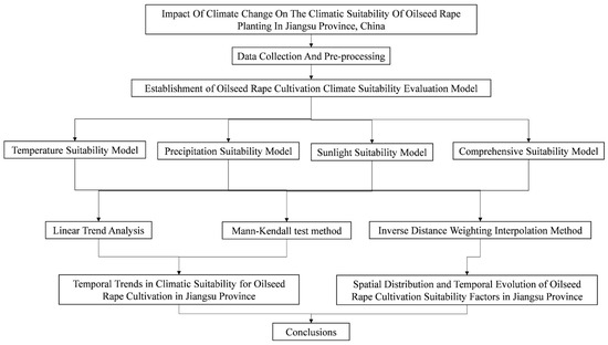 The IPCC AR6 indicates that the global average temperature has risen by approximately 1 °C compared to that before the Industrial Revolution and is projected to increase by 1.5 °C or more in the coming 20 years [5]. Shifts in temperature, precipitation, and solar radiation have modified agricultural climate resources, in turn affecting crop distribution, cropping systems, planting structures, and suitability, while triggering cascading effects on yield and quality [6,7,8]. Under the background of climate change, the agro-climatic resources, such as temperature, precipitation, and solar radiation, have largely changed in Jiangsu Province [8]. Consequently, in the context of global climate change, widespread attention has been paid to the regional climatic resource, climatic suitability, and the future trends for oilseed rape planting [9].