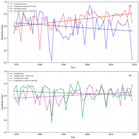Temporal change in average suitability index for oilseed rape in Jiangsu Province: (a) temperature and precipitation suitability; (b) sunlight and comprehensive suitability.