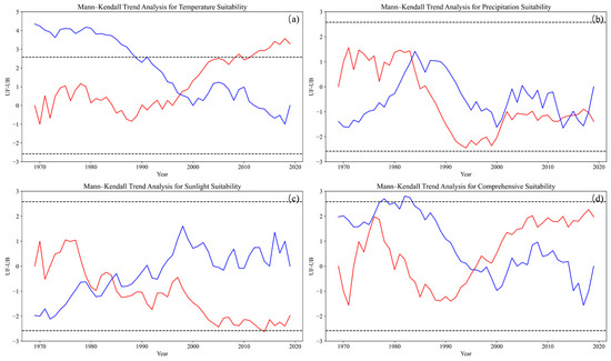 Mann–Kendall test for suitability index for oilseed rape during the reproductive period in Jiangsu Province (the red curve represents the UF curve, and the blue curve represents the UB curve.): (a) temperature suitability; (b) precipitation suitability; (c) sunlight suitability; (d) comprehensive suitability.