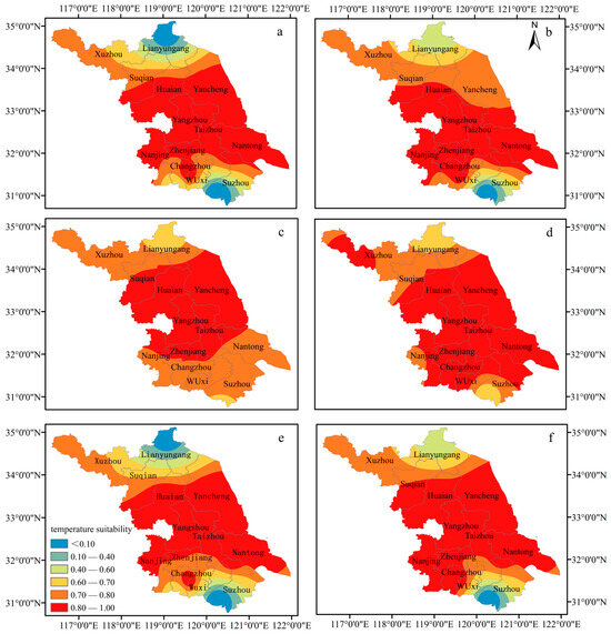 Distribution of temperature suitability for oilseed rape in Jiangsu Province: (a) 1969–1978; (b) 1979–1988; (c) 1989–1998; (d) 1999–2008; (e) 2009–2018; (f) 1969–2018.
