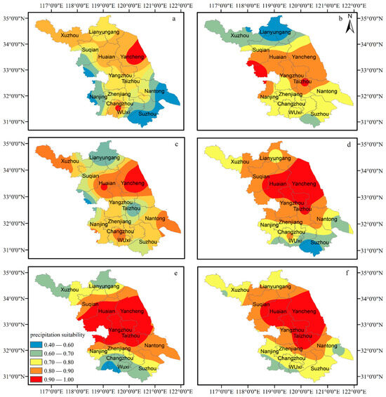Distribution of precipitation suitability for oilseed rape in Jiangsu Province: (a) 1969–1978; (b) 1979–1988; (c) 1989–1998; (d) 1999–2008; (e) 2009–2018; (f) 1969–2018.