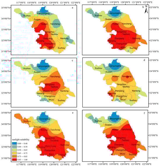 Distribution of sunlight suitability for oilseed rape in Jiangsu Province: (a) 1969–1978; (b) 1979–1988; (c) 1989–1998; (d) 1999–2008; (e) 2009–2018; (f) 1969–2018.