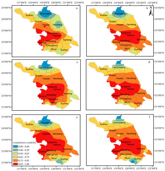 Distribution of comprehensive suitability for oilseed rape in Jiangsu Province: (a) 1969–1978; (b) 1979–1988; (c) 1989–1998; (d) 1999–2008; (e) 2009–2018; (f) 1969–2018.