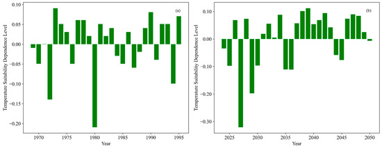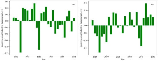 A comparison of composite suitability levels between the historical period (1969–2018; Figure 13a) and the future period (2024–2050; Figure 13b) reveals that the magnitude of fluctuations in composite suitability during the future period is statistically significantly greater than that during the historical period. Specifically, positive peaks in the later stage of the future period are more pronounced, while negative extremes are more intense. This indicates that fluctuations in composite suitability driven by future climate change will be more drastic, and there is a tendency toward more extreme scenarios (either more suitable or less suitable).