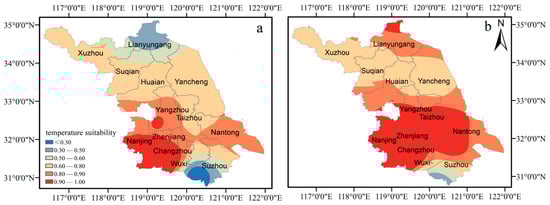 Spatial distribution of temperature suitability for oilseed rape in Jiangsu: (a) last 50 years; (b) SSP2 4.5 scenario.