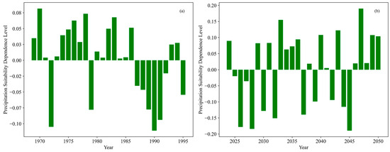 A comparison of the precipitation suitability anomalies in Figure 11a (1969–2018) and Figure 11b (2024–2050) indicates that under the current climate conditions (Figure 11a), the precipitation suitability anomaly fluctuates within a narrow range of approximately −0.10 to 0.08. There is no evident long-term unidirectional trend, with only alternating positive and negative anomalies observed. In contrast, during the future projection period (Figure 11b), the fluctuation range of precipitation suitability anomalies widens significantly, spanning from −0.20 to around 0.20. This suggests that the magnitude of changes in precipitation suitability will increase substantially in the future, resulting in heightened climate variability. Furthermore, although positive and negative anomalies will continue to coexist in the future, there is a tendency toward more extreme anomalies, with the potential for stronger positive deviations (i.e., higher precipitation suitability) and negative deviations (i.e., lower precipitation suitability). This reflects greater uncertainty in precipitation conditions influencing the growth of oilseed rape.