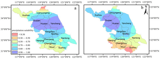 Spatial distribution of precipitation suitability for oilseed rape in Jiangsu: (a) last 50 years; (b) SSP2 4.5 scenario.