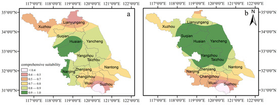 Spatial distribution of comprehensive suitability for oilseed rape in Jiangsu: (a) last 50 years; (b) SSP2 4.5 scenario.
