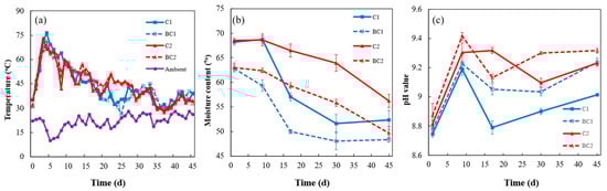 Changes in (a) temperature, (b) moisture content, and (c) pH during composting under different treatments: heap composting (C1), heap composting with biochar (BC1), aerobic composting (C2), and aerobic composting with biochar (BC2).