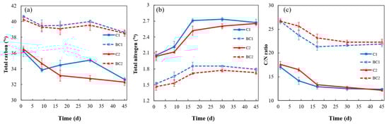 The temporal variations in the total carbon (TC) content across the four treatment groups are shown in Figure 2a. During the initial 9 days, the TC decreased in all treatment groups, reflecting rapid microbial mineralization of labile organic carbon. However, during days 10–30, the TC increased in the anoxic treatment group (C1: +5.2%; BC1: +6.8%), likely because mass loss from volume reduction and moisture depletion concentrated residual carbon []. The TC subsequently steadily decreased in all the systems until composting concluded, with higher carbon loss rates in the thermophilic phase (days 0–15) than in the later stages, which is consistent with the progressive depletion of degradable substrates []. The final TC values were 32.7% (C1), 32.3% (C2), 38.6% (BC1), and 38.5% (BC2), representing net reductions of 9.85%, 11.5%, 5.00%, and 4.30% from the initial levels, respectively. The biochar-containing treatments (BC1 and BC2) resulted in significantly lower carbon loss, which is consistent with the findings of Hagemann et al. [], who attributed the reduced carbon loss in manure compost to the recalcitrant structure and adsorption properties of biochar. The highly specific surface area and cation exchange capacity of biochar facilitate the stabilization of organic carbon via chemical bonding with oxidized functional groups (e.g., carboxyl and hydroxyl groups), thereby increasing carbon sequestration []. These results demonstrate the potential of biochar to reduce carbon loss during composting, thereby enhancing both carbon retention and the quality of the final product.