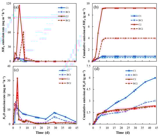 Changes in the emission rates and cumulative emissions of NH3 (a,b) and N2O (c,d) during composting.
