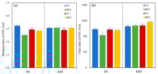 The Chao1 and Shannon indices serve as quantitative measures of microbial community richness and diversity, respectively, within composting systems []. Higher Chao1 values denote greater species richness, whereas elevated Shannon indices reflect increased community diversity []. Initial assessments revealed that, compared with the control treatments (C1 and C2), the biochar-containing treatments (BC1 and BC2) reduced the Chao1 and Shannon indices, which was likely attributable to the influence of biochar on the initial substrate C/N ratio (Figure 2c). However, at the conclusion of the 45-day composting period, both indices significantly increased in the BC1 and BC2 groups (Figure 4a,b), indicating increased species richness and community diversity in the biochar-amended systems. This shift suggests that biochar initially moderates the microbial community structure but, ultimately, fosters a more diverse and robust microbiota. Mechanistically, biochar enhances microbial nitrogen assimilation capacity by serving as a habitat for microbial colonization and a reservoir for nutrient retention, thereby mitigating nitrogen losses during composting []. These findings highlight that both composting methodology (aerobic vs. anoxic) and additive application (biochar) shape bacterial community dynamics and functional outcomes.