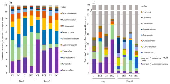Community composition of bacteria at the (a) phylum and (b) genus levels during composting. D1, 45 is a sample from the first few days. C1, BC1, C2, and BC2 represent aerobic composting, aerobic composting + 10% biochar, simple heap composting, and simple heap composting + 10% biochar, respectively.