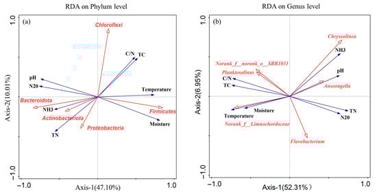 Redundancy analysis (RDA) was performed to elucidate the mechanistic interplay between physicochemical properties, gaseous emissions, and microbial communities during composting (Figure 6). At the phylum level, environmental parameters (e.g., pH, TN, TC, the C/N ratio, and temperature) and gas emissions (NH3 and N2O) collectively explained 57.11% of the bacterial community variation (Figure 6a). Bacteroidota was strongly positively correlated with pH, TN, NH3, and N2O, which is consistent with its role in nitrogen transformation and organic acid metabolism under alkaline conditions []. Conversely, Firmicutes—predominant during the thermophilic phase—showed significant negative correlations with NH3 and N2O emissions, suggesting that biochar has the capacity to mitigate emissions by enriching this heat-resistant, carbohydrate-degrading phylum []. The relative abundance of Chloroflexi was positively correlated with TC content, C/N ratio, and temperature, likely due to its metabolic versatility in carbon-rich, thermophilic environments, whereas the relative abundance of Proteobacteria displayed inverse trends, potentially reflecting its sensitivity to oxygen fluctuations [].