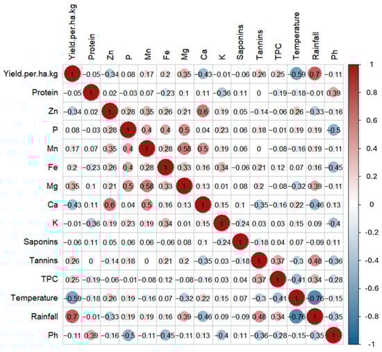 Spearman Correlation matrix showing associations among environmental factors, grain yield per ha, nutrient content, and secondary metabolites. Spearman correlation matrix; Yield.per.ha.kg-Yield as kilograms per hectare; Protein; Zn-Zinc; P-Phosphorus; Mn-Manganese; Fe-Iron; Mg-Magnesium; Ca-Calcium; K-Potassium; Saponins; Tannins; TPC-Total polyphenol content; Temperature; Rainfall (R); and pH-Potential of hydrogen.