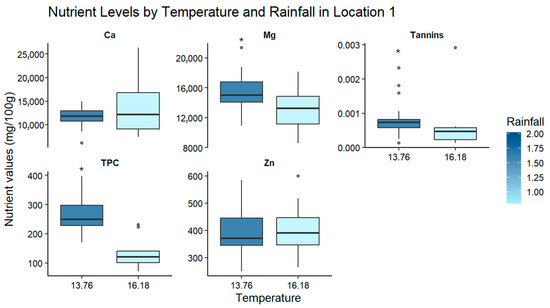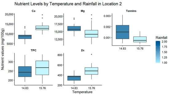 The boxplots (Figure 2 and Figure 3) highlight a significant (p < 0.05) difference in nutrient uptake in faba beans under different environmental conditions, which aligns with the correlation trend described above. At Location 1 (Figure 2), significantly higher concentrations (p < 0.05) of total polyphenol, tannins, and magnesium contents were observed in plants exposed to higher temperature and lower rainfall. In contrast, Location 2 (Figure 3) did not exhibit statistically significant differences in nutrient concentrations.