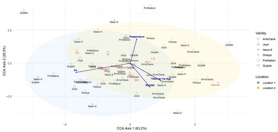 CCA Biplot illustrating the influence of temperature and rainfall on nutrient profiles across varieties and locations. Samples are reported in black, having specific symbols for each variety (reported in legend). The samples are grouped in ellipses representing location 1 (blue) and location 2 (yellow). Environmental variables as Temperature, Rainfall as well as Ph and yield per ha(kg) are represented as arrows in the biplot figure. Lastly, plant nutritional characteristics are reported in red.