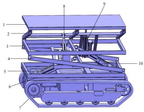 To fulfill these specifications, a new omnidirectional leveling system for tracked agricultural chassis has been developed as illustrated in Figure 1 This system comprises a body frame, intermediate frame, chassis frame, upper and lower supports, along with four leveling servo-electric cylinders. These cylinders are interconnected via hinge joints between the body frame and chassis frame which facilitates controlled cylinder extension and retraction for effective longitudinal and lateral slope leveling. By integrating a hinged point-line composite support structure combined with a double-layer leveling configuration, this design effectively addresses the “leg vacancy” phenomenon frequently observed in multi-point support systems during dynamic leveling operations [36,37]. Notably, lateral and longitudinal leveling functions remain decoupled which ensures independent control while enhancing overall system performance.