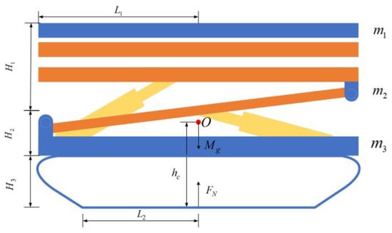 In the figure, denotes the mass of the upper frame (), while represents the mass of the intermediate frame (). The total mass of the chassis assembly (including the lower frame) is defined as (). The vertical separation between the upper and intermediate frames is designated (), and indicates the height difference between the intermediate frame and the bottom frame (). corresponds to the overall chassis height (). The parameter quantifies the vertical distance from the system’s center of mass to the slope surface. Geometrically, specifies the distance from the uppermost point of the upper frame to the central axis (), and defines the distance from the top plane of the chassis to this same central axis (). For mechanical equilibrium analysis, signifies the ground support reaction force, and represents the full-machine gravitational force.