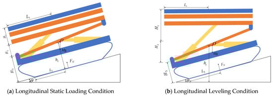 This study employs analytical computation to determine the center of mass for the tracked agricultural machinery. As illustrated in Figure 2, the center-of-mass offset (indicating the displacement of the center of mass before and after the leveling process) and its vertical distance to the slope surface under static loading can be mathematically expressed as: