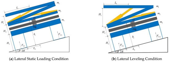 In a similar manner, the lateral rollover angle during leveling operations is calculated utilizing the moment equilibrium equation (Equation (16)), as delineated in Equation (17).