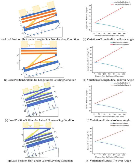 In a similar vein, the longitudinal rollover angles during leveling operations are derived from the moment equilibrium equations (Equations (10) and (12)), as illustrated in Equations (11) and (13), respectively. Specifically, Equation (11) pertains to the longitudinal rollover angle when the front servo-electric cylinder is working, while Equation (13) corresponds to the longitudinal rollover angle where the rear servo-electric cylinder is working.