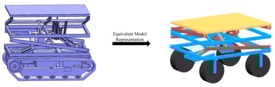 The chassis operates as a carrier for the tracked locomotion mechanism while integrating various subsystems that contribute to its inherent structural complexity. In preserving essential mechanical characteristics within this model simplification process: auxiliary components not impacting device dynamics were removed; complex geometries of tracked locomotion were approximated using an equivalent wheeled configuration (Figure 7).