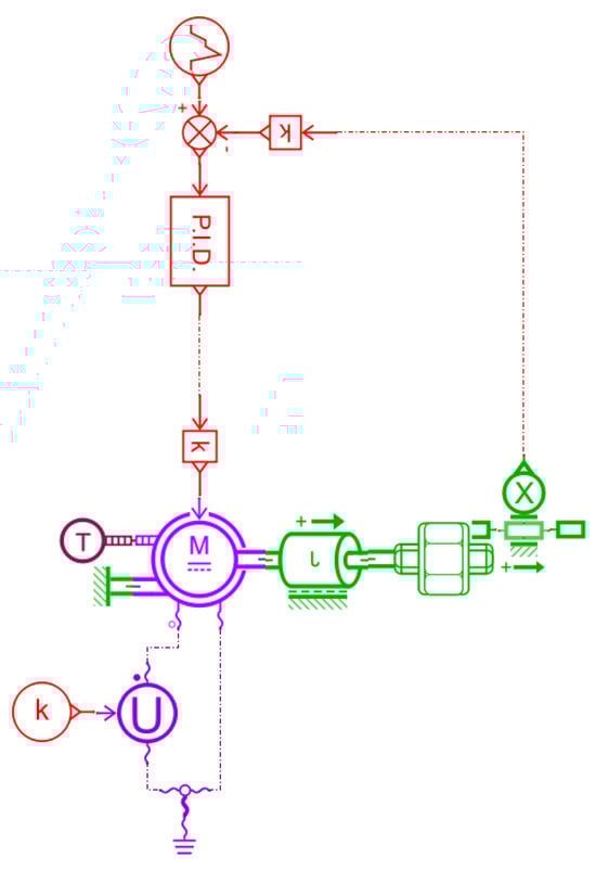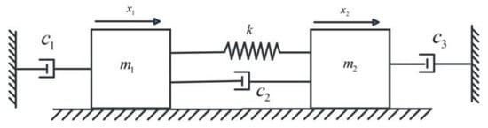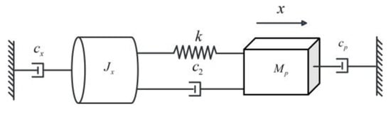 Based on the principle of dynamic equivalence, this study presents a refined model of the ball screw feed system, as illustrated in Figure 11. The model employs a dual-mass modeling approach that achieves structural simplification via systematic parameter equivalence while preserving key dynamic characteristics. In the process of model development, equivalent representations for both system inertia distribution and elastic deformation behavior are incorporated. Two kinematically coupled mass units are utilized to effectively capture the core dynamic response of the system. This method ensures an accurate representation of the physical system while enhancing computational efficiency through model order reduction. Furthermore, it establishes a theoretical foundation for analyzing system dynamics and designing advanced control algorithms.